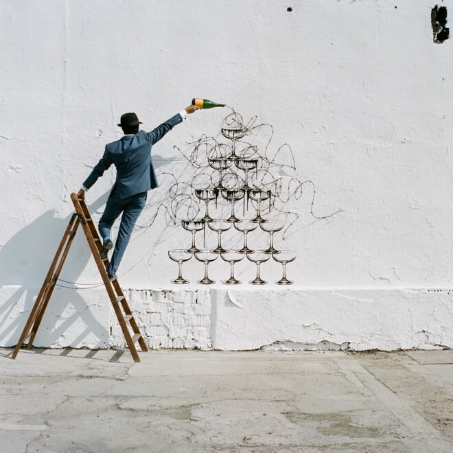 Check out the work of South African artist Robin Rhode. Inspired by street culture using charcoal, chalk and paint, he created drawings on walls and then performed in front of the drawings. He photographed the interaction between the two-dimensional imagery and three-dimensional performers to capture and critique everyday experiences.
