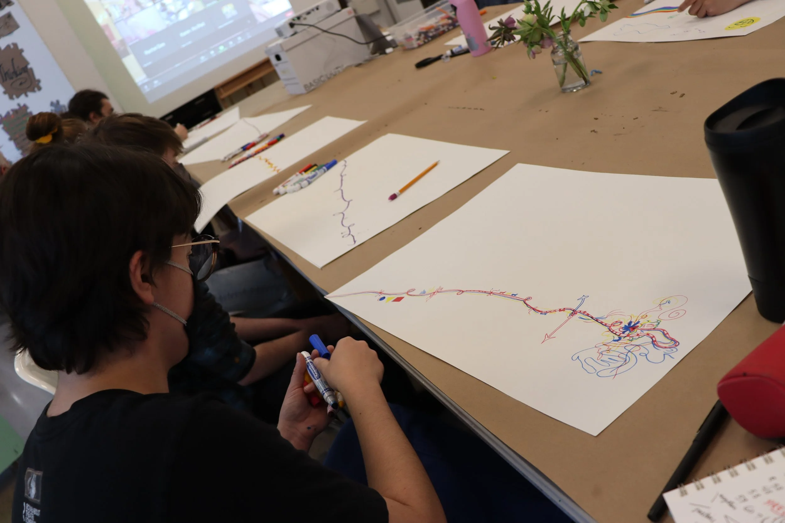 Linda then encouraged us to add to our lines and express more specific thoughts. I used little running stick figures to represent my looping attempts to reach a higher level of optimism. When everyone had finished, we passed our lines to the right and interpreted the other person’s line. It was an interesting opportunity to pick everyone’s brains and reflect upon ourselves. I find that self-reflection on its own is invaluable, but doing it in a group with art was a fantastic opportunity. Linda herself engaged with each artist’s work in a deeply introspective way, turning over every stone and leaving no intention unnoticed.