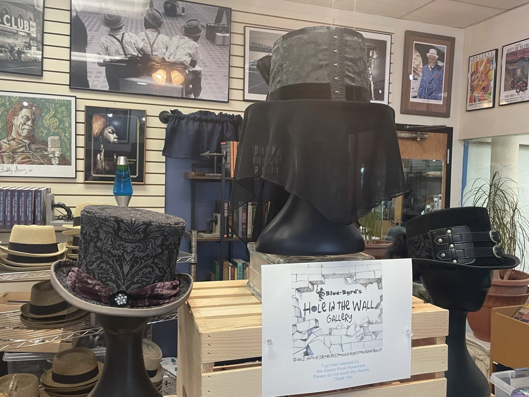 The art of the hat is one that is often overlooked. Most of the time people don’t even wear them. But the most iconic of the head’s accessories has an expansive amount of possibilities and utilities. Hats are typically made to protect, warm, or provide shade to the head. However, the design of hats often precede those functions. In July I had the privilege of seeing hats made by Hudson Valley artist Deborah Ryan. Her steampunk-inspired creations are on display at Blue Byrd’s Hole In The Wall gallery, at 320 Wall St.
