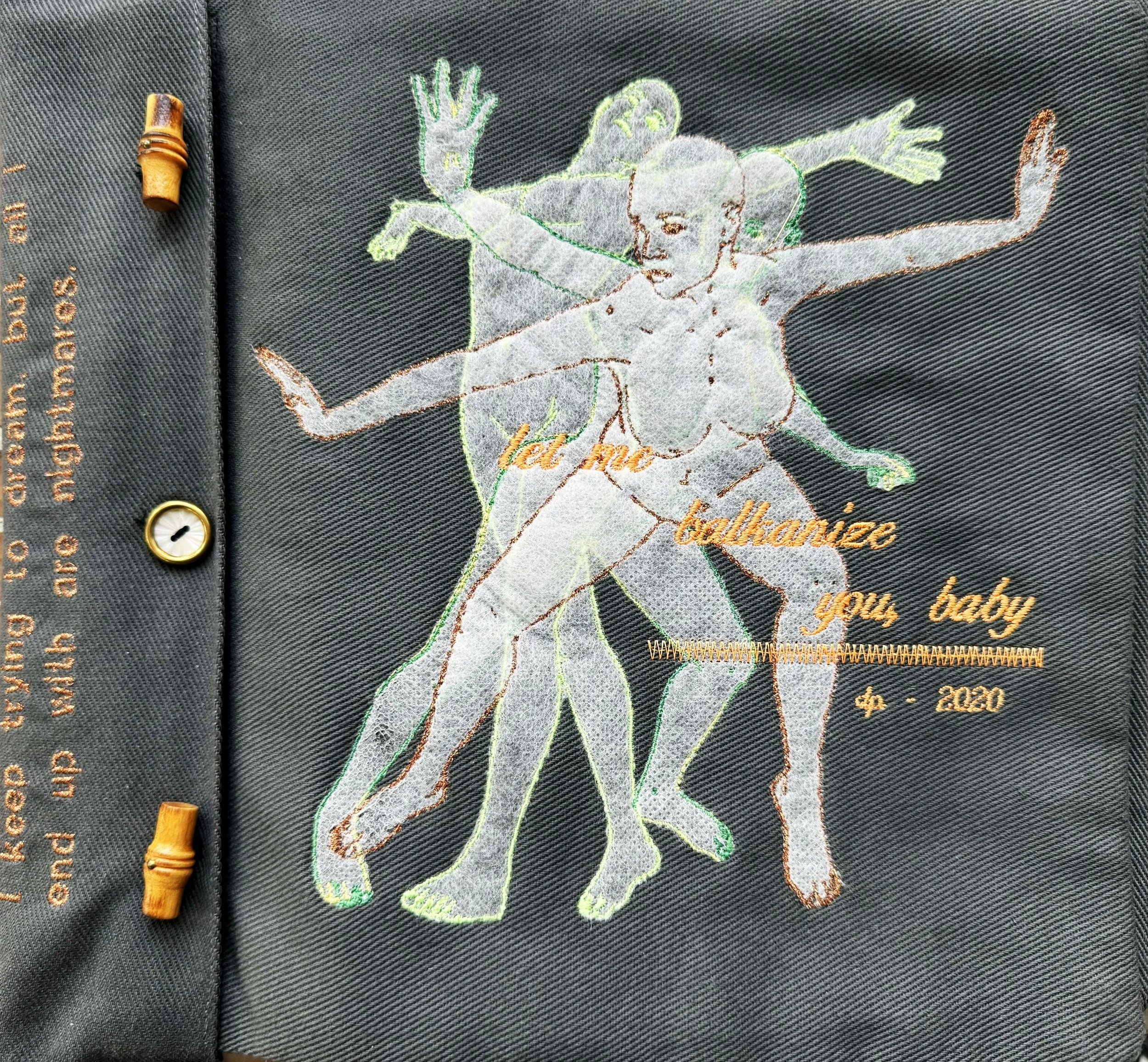 Another interesting book in the collection is “Let me Balkanize You, Baby” by Danica Pantic, which is a textile book of embroidered imagery and text, dealing with the subjects of isolation in the midst of the Covid-19 pandemic. The book is made from fabric Pantic used to create homemade masks in 2020, embroidered with poetry and correlating images that relate to the sensation of dread and loneliness.
