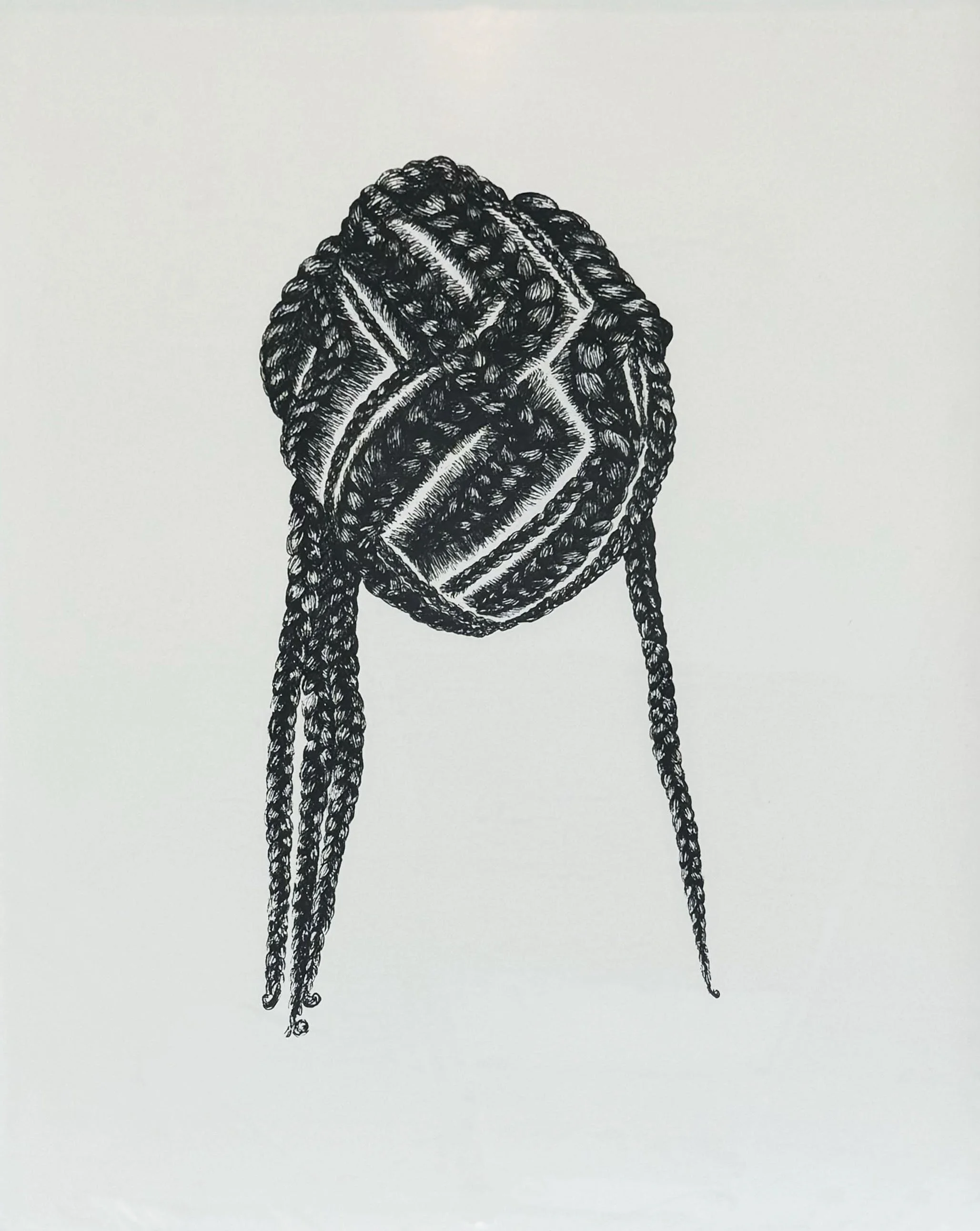 Along with their publications, Eureka! presents a large assortment of artworks in varying mediums from their art residents. Crossroads by Jazmine Hayes, which is a part of her collection called Bloodline, is an ink drawing which showcases African hair braiding. Hayes presents a unique perspective, displaying the braids from the crown of the head, transforming the recognizable imagery into an interesting abstracted design. The intention of this work is to exhibit the relationship between hair and African American identity, expressing the importance of preserving and representing culture. Hayes' work is just one example of the visual arts throughout this collection. There are dozens of pieces in the exhibition that represent over 50 unique artists from all over the country.